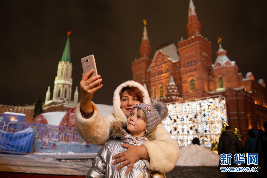 2018年12月31日,在俄罗斯首都莫斯科,人们在迎新年活动中自拍。 新华社发(叶夫根尼·西尼岑摄)