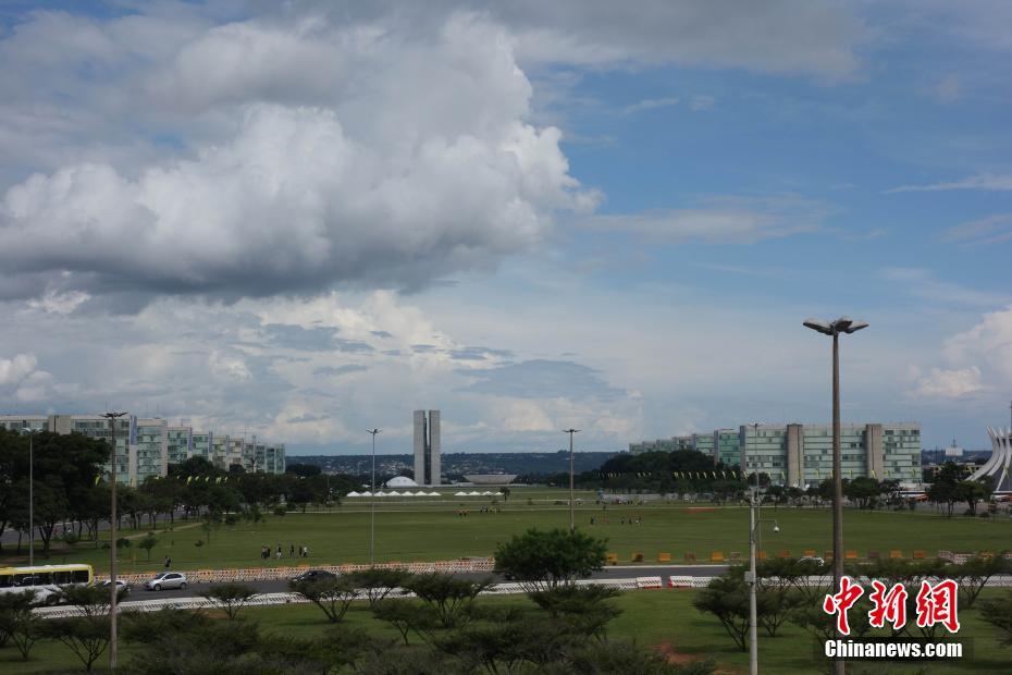 在巴西首都巴西利亚,高耸的国会大厦在蓝天白云下特别惹人注目。中新社记者 莫成雄 摄