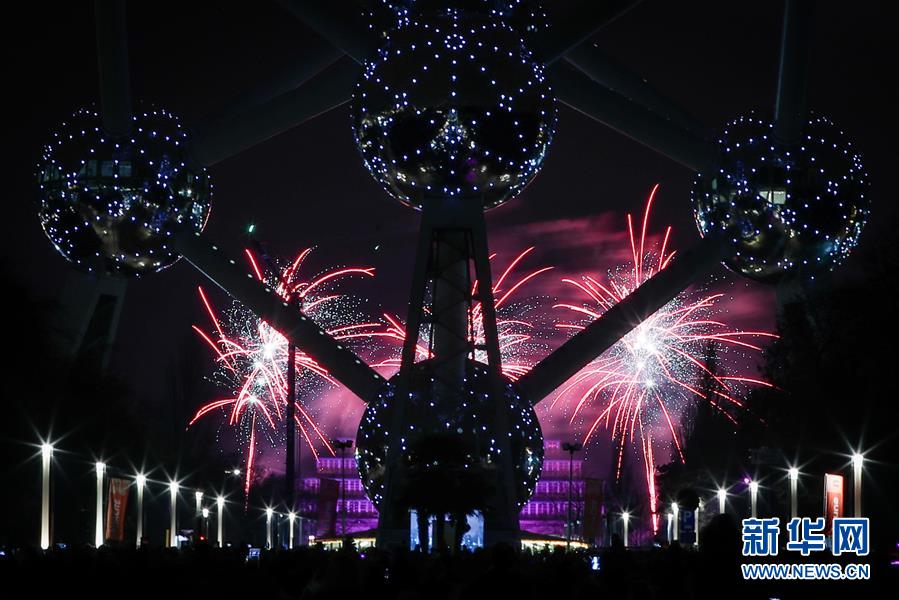 1月1日,比利时首都布鲁塞尔的地标性建筑——原子球塔附近烟花绽放。 新华社记者郑焕松摄