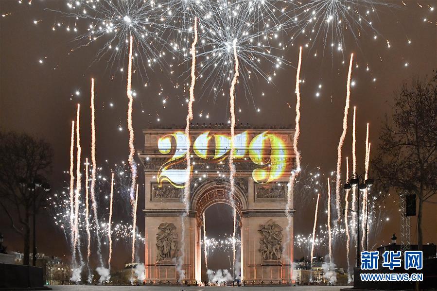 这是1月1日在法国巴黎凯旋门拍摄的灯光秀和烟火。 法国巴黎以在凯旋门打上投影灯光和放烟火的方式迎接新年的到来。 新华社记者陈益宸摄