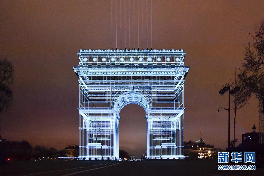 这是2018年12月31日在法国巴黎凯旋门拍摄的灯光秀。 新华社记者陈益宸摄