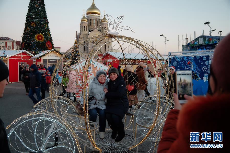 1月1日,在俄罗斯符拉迪沃斯托克市,市民在市中心广场拍照留念。当日,俄罗斯远东城市符拉迪沃斯托克市中心广场举行“新年散步”活动,市民可以在这里欣赏和购买各种新年装饰物,欢度新年第一天。新华社记者 吴刚 摄