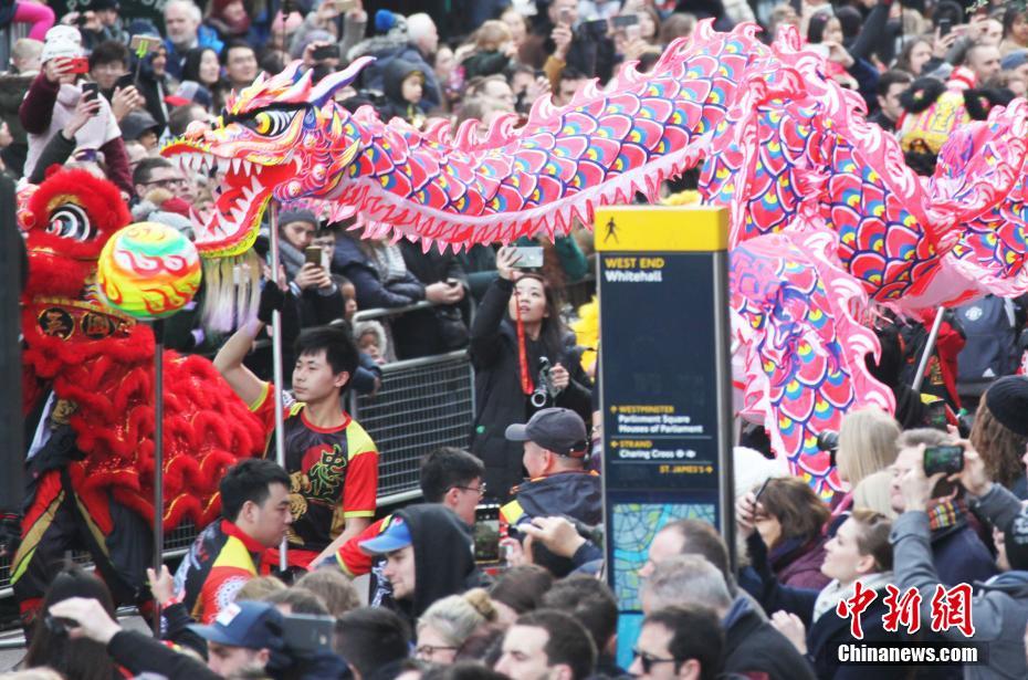 当地时间1月1日,伦敦2019年元旦游行在伦敦市中心街道举行。近200伦敦华人组成的舞龙、舞狮、大熊猫、安塞腰鼓方队,欢快热烈、特点鲜明,在游行队伍中耀眼夺目,展示出了风格独特的东方文化神韵。来自英国本地与欧洲、美洲等世界各地的上万名表演者,参加了这个拥有33个年头的传统迎新年活动,沿街簇拥观看的英国民众达数十万。图为华人舞龙队行进在英国观众人潮中。中新社记者 张平 摄