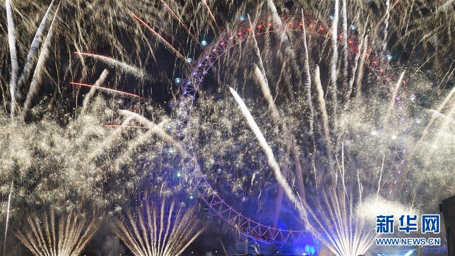 1月1日,英国伦敦举行烟花表演迎接新年。  新华社发(桂子摄)
