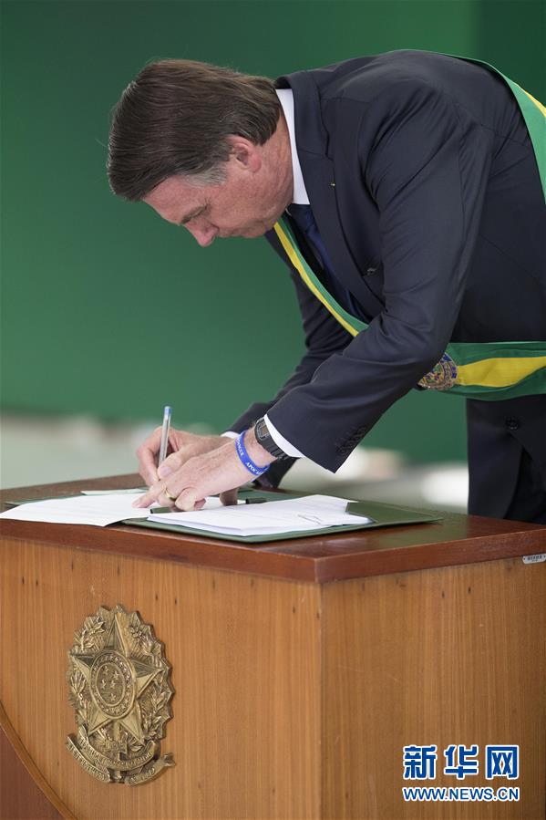 1月1日,在巴西首都巴西利亚的总统府“高原宫”,巴西总统雅伊尔·博索纳罗在就职典礼上签署文件。 新华社记者李明摄