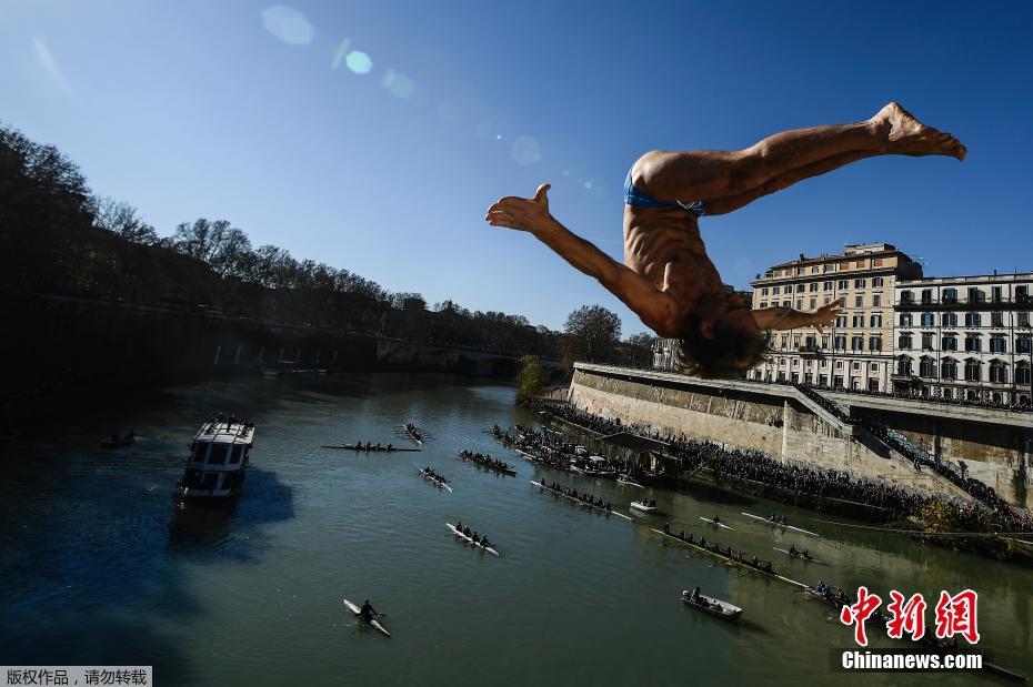 当地时间2019年1月1日,意大利罗马举办新年高空跳水(Tiber Dive)活动,参加者需要从18米高的加富尔桥(Cavour Bridge)上一跃而下。