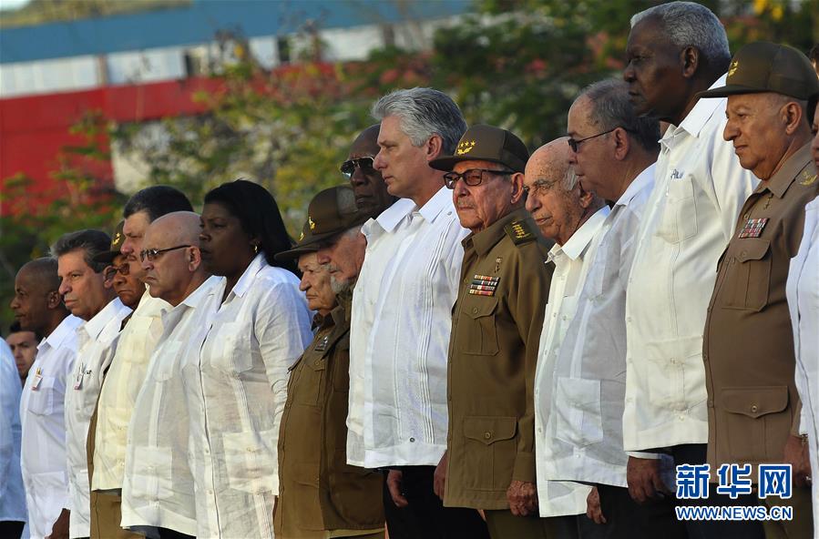 1月1日,在古巴圣地亚哥城北部的圣伊菲热尼亚公墓,古巴共产党中央委员会第一书记劳尔·卡斯特罗(右五)与古巴国务委员会主席兼部长会议主席迪亚斯-卡内尔(右六)参加古巴革命胜利60周年纪念活动。 古巴共产党中央委员会第一书记劳尔·卡斯特罗1日在参加古巴革命胜利60周年纪念活动时表示,古巴已准备好面对美国重新对古采取的对抗态度。 新华社发