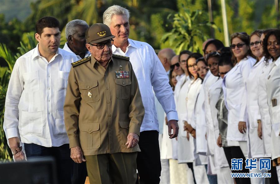 1月1日,在古巴圣地亚哥城北部的圣伊菲热尼亚公墓,古巴共产党中央委员会第一书记劳尔·卡斯特罗(前)与古巴国务委员会主席兼部长会议主席迪亚斯-卡内尔(后排右)参加古巴革命胜利60周年纪念活动。 古巴共产党中央委员会第一书记劳尔·卡斯特罗1日在参加古巴革命胜利60周年纪念活动时表示,古巴已准备好面对美国重新对古采取的对抗态度。 新华社发