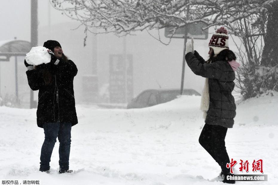 当地时间2019年1月3日,欧洲多地迎来降雪天气,大雪将城市变成了一个个浪漫的冰雪世界。图为希腊民众在街头打雪仗。