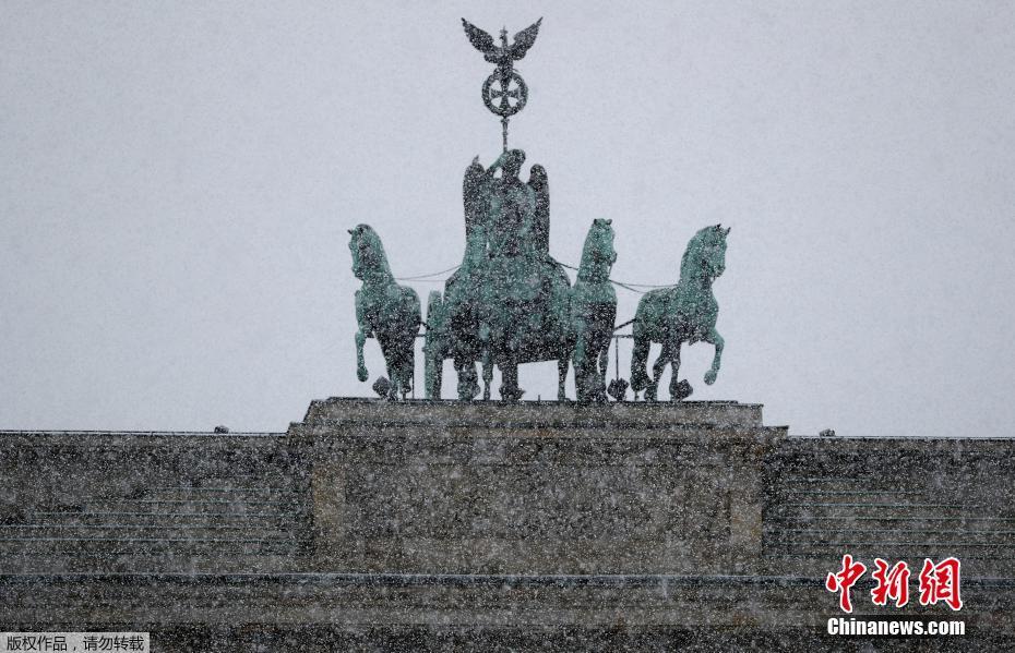 当地时间2019年1月3日,欧洲多地迎来降雪天气,大雪将城市变成了一个个浪漫的冰雪世界。图为雪中德国柏林的勃兰登堡门上的雕像。