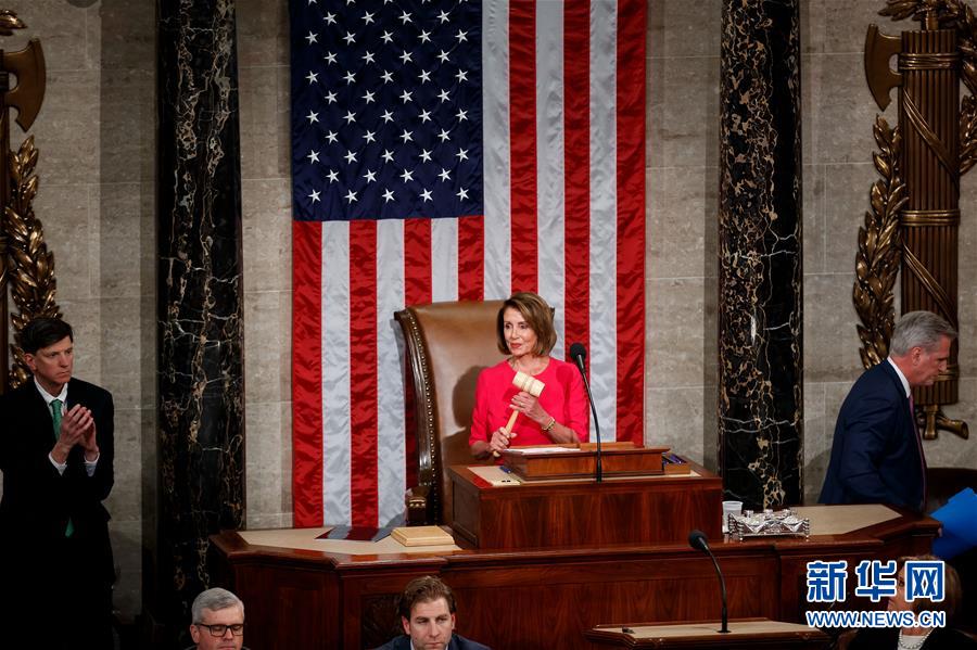 佩洛西当选众议院议长 1月3日,在美国华盛顿,南希·佩洛西(中)当选国会众议院议长后手持木槌。新华社发(沈霆摄)