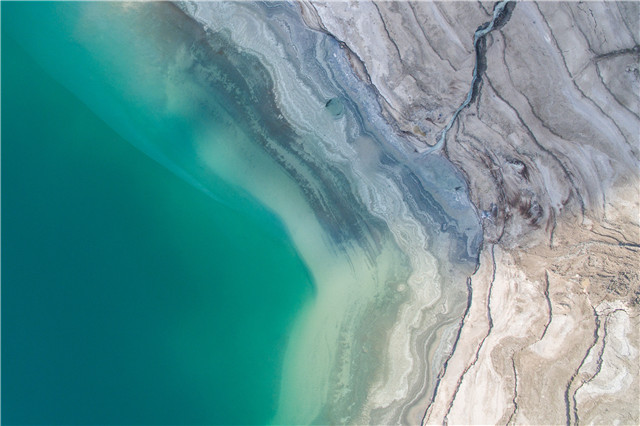 2018年4月8日,在约旦河西岸的死海岸边,水位线后退的痕迹清晰可见。管理不善、过度开发、气候变化、水源不足等因素令死海逐年“萎缩”。新华社记者郭昱摄