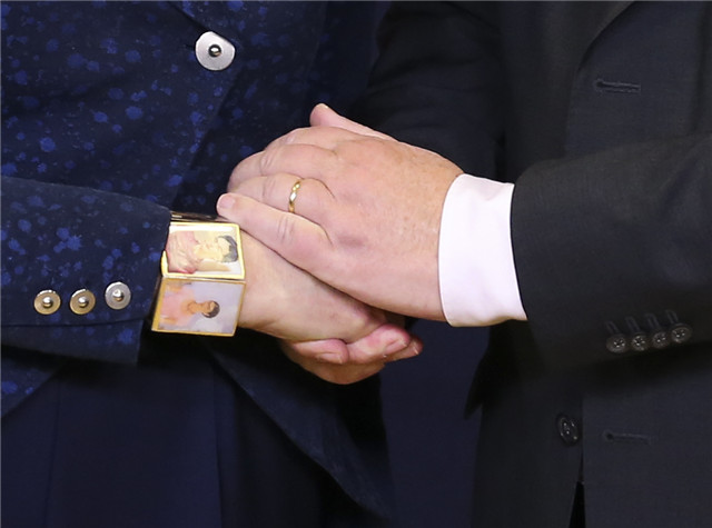 2018年11月25日,在比利时布鲁塞尔,欧盟委员会主席容克(右)与英国首相特雷莎·梅握手。当日,欧盟成员国领导人正式通过此前与英国达成的“脱欧”协议。新华社记者叶平凡摄