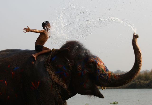 2018年12月27日,在尼泊尔奇特旺,一名儿童在大象节上和大象戏水。新华社发(苏尼尔·夏尔马摄)