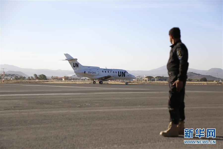 1月5日,在也门萨那国际机场,一名士兵站在联合国也门问题特使马丁·格里菲思乘坐的飞机附近。新华社发(穆罕默德摄)
