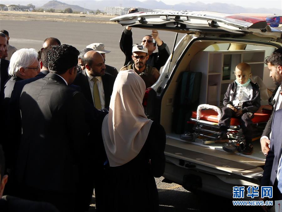 1月5日,联合国也门问题特使马丁·格里菲思(左一)抵达也门萨那国际机场后看望一名罹患癌症的也门儿童。新华社发(穆罕默德摄)