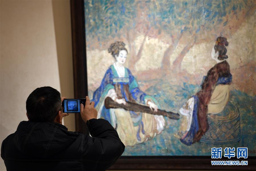 1月6日,在甘肃省艺术馆,观众拍摄俄罗斯画家画敦煌系列油画作品。新华社记者 范培珅 摄