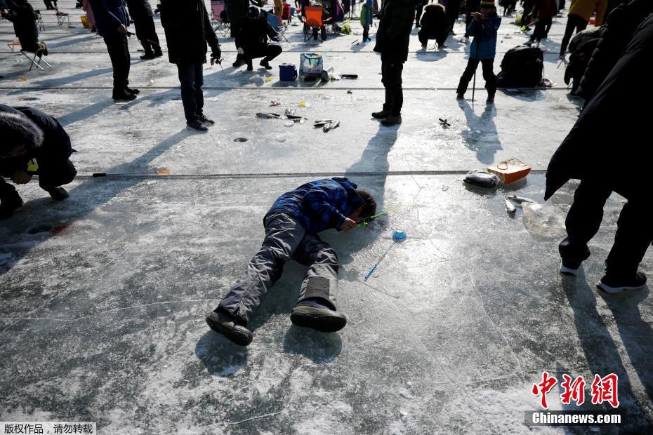 近日,韩国江原道华川郡,一年一度的华川鳟鱼节盛大开幕,吸引众多冰钓游客前往,现场人山人海,场面壮观。图为一名游客趴在冰面上全神贯注钓鳟鱼。