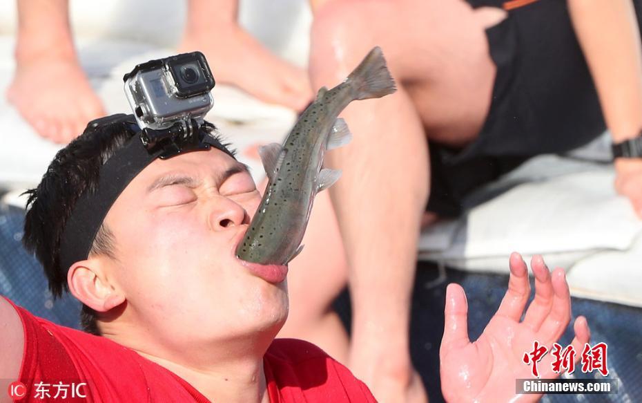 近日,韩国江原道华川郡,一年一度的华川鳟鱼节盛大开幕,吸引众多冰钓游客前往,现场人山人海,场面壮观。图为游客参加徒手抓鱼活动,玩得不亦乐乎。