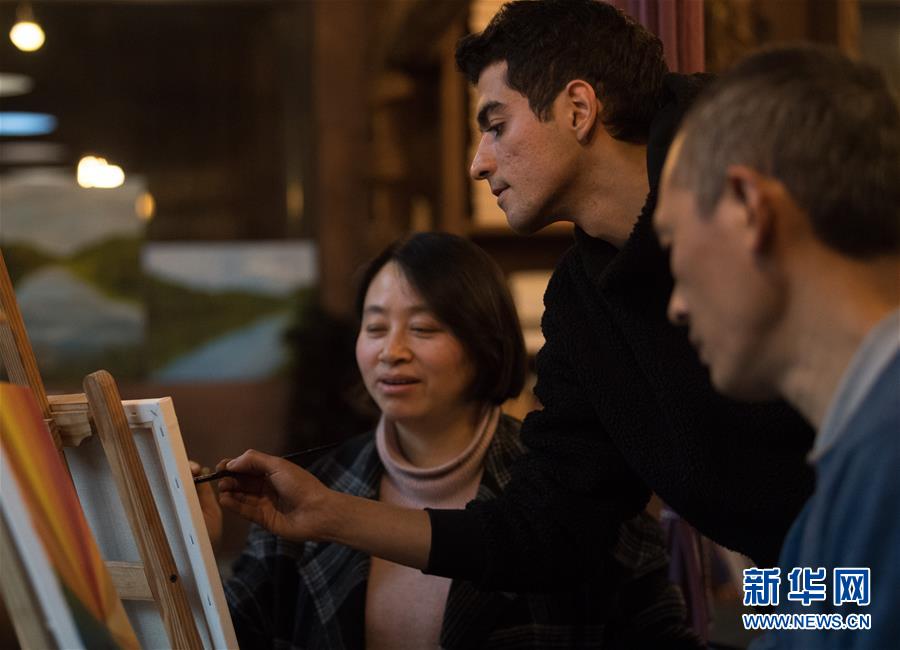 1月7日,旺仔(中)在位于埭溪镇山背村狮子山庄的工作室指导民宿工作人员画油画。
