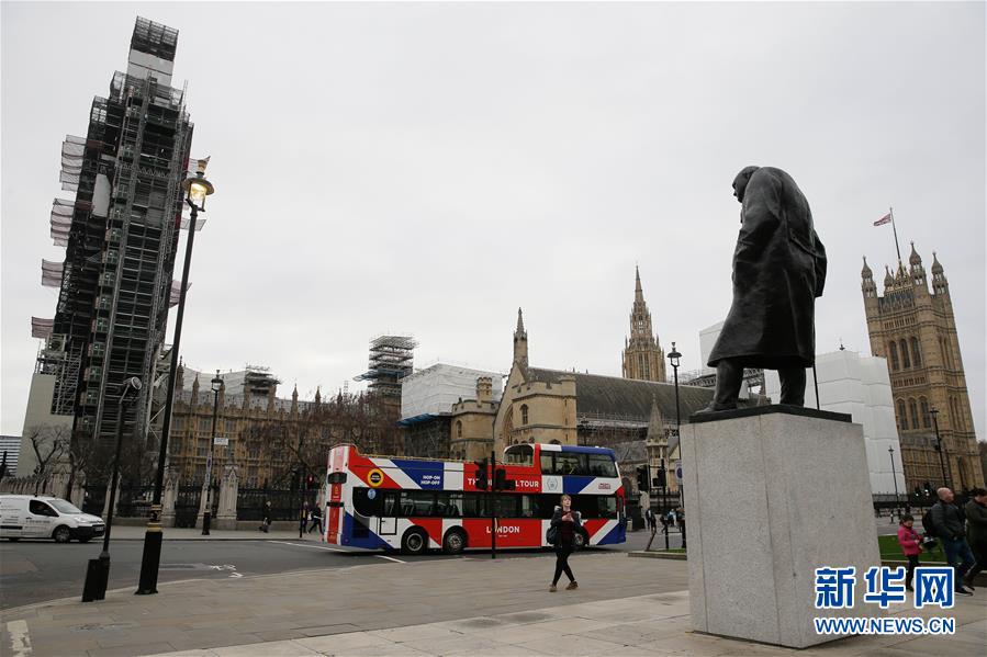 这是1月7日在英国首都伦敦议会大厦外拍摄的丘吉尔雕像。