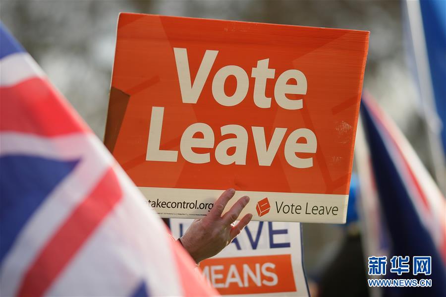 1月9日,在英国伦敦,“脱欧”支持者在议会大厦外集会时手举标语牌。 英国首相府8日确认,一度推迟的“脱欧”协议投票表决将于15日在议会下院举行。 新华社发(蒂姆·爱尔兰 摄)