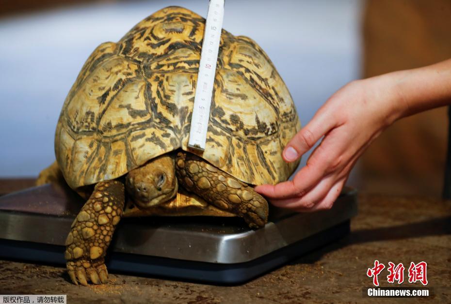 当地时间2019年1月9日,德国西部杜伊斯堡,当地动物园举行年度盘点,动物们量身高测体重,乌龟量身高。