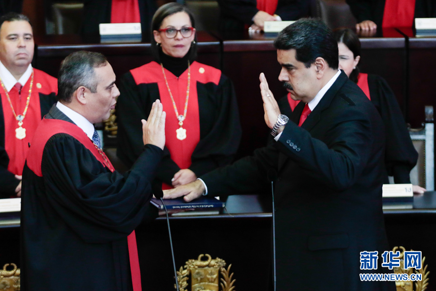 1月10日,委内瑞拉总统马杜罗(右)在加拉加斯举行的连任就职仪式上宣誓就职。 新华社发(委内瑞拉总统府供图)