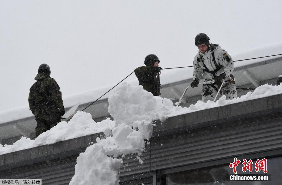 当地时间2019年1月10日,德国贝尔赫茨加登,德国士兵正在清除一所高中建筑屋顶上的积雪。