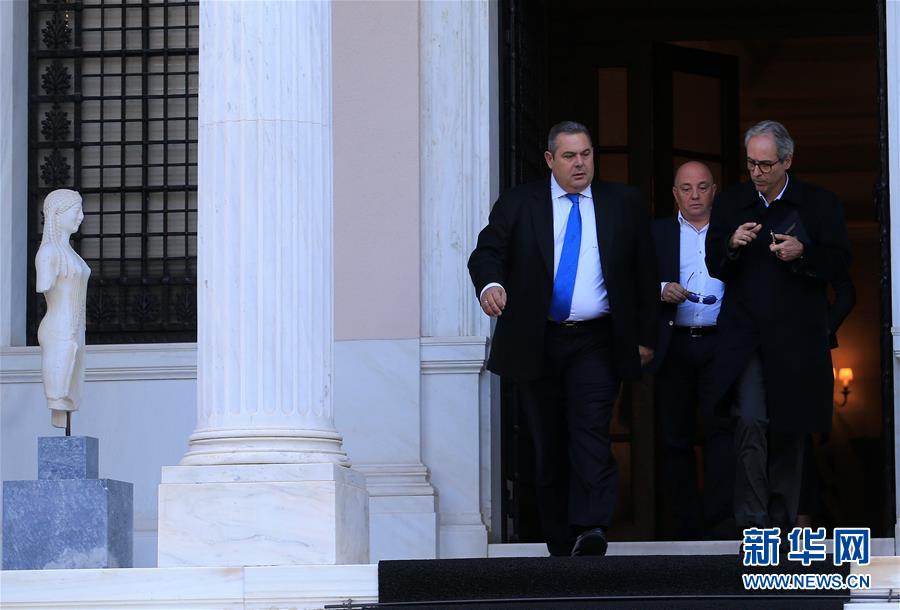 1月13日,希腊国防部长坎梅诺斯(左)离开位于雅典的总理府。 希腊国防部长坎梅诺斯13日宣布,由于对马其顿更改国名协议持反对意见,他将辞去国防部长一职,由他领导的独立希腊人党将退出联合政府。希腊总理齐普拉斯随后发表声明说,接受坎梅诺斯的辞职,也将接受来自独立希腊人党的其他政府部长的辞职。 新华社发(马里奥斯·罗洛斯摄)