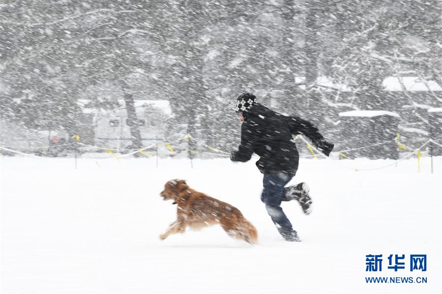 1月13日,在美国首都华盛顿,一名男子与宠物狗在林肯纪念堂旁玩耍。 近日,美国首都华盛顿及其周边地区普降暴雪。降雪导致部分航班晚点或取消,道路交通事故增多。 新华社记者 刘杰 摄