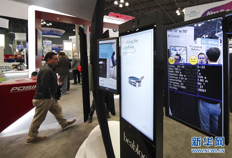 1月13日,在美国纽约,参观者在美国全国零售商联合会年度大会上观看一款智能导购机。 当日,为期三天的美国全国零售商联合会年度大会开幕,来自世界各地的792家展商展出最新的零售业解决方案、硬件设备和发展趋势等,吸引超过3万名参观者和专业人士参会。 新华社记者 王迎 摄