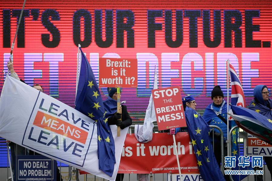 1月14日,在英国伦敦,支持脱欧和反对脱欧的示威者在议会大厦外手举旗帜和标语牌。新华社发(蒂姆·爱尔兰摄)