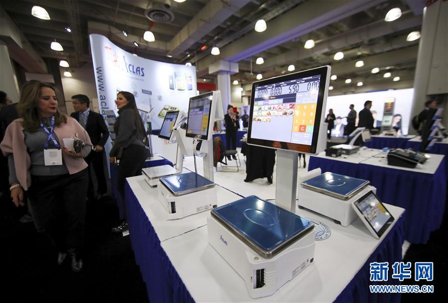 1月13日,在美国纽约举行的全国零售商联合会年度大会上,参观者在顶尖电子(厦门)有限公司的展台观看触控收银秤。 美国全国零售商联合会年度大会于1月13日至15日在纽约举行,众多中国零售企业和设备厂商参加大会,分享发展经验的同时拓展商机。 新华社记者 王迎 摄