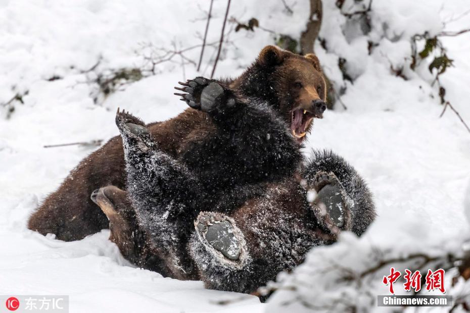 德国两头棕熊化身“摔跤手”雪地里互殴