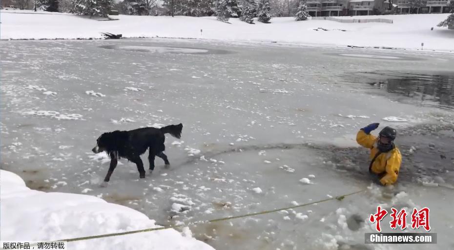 近日,美国科罗拉多州隆娜特里,地铁消防救援人员在几乎结冰的池塘救一只狗。