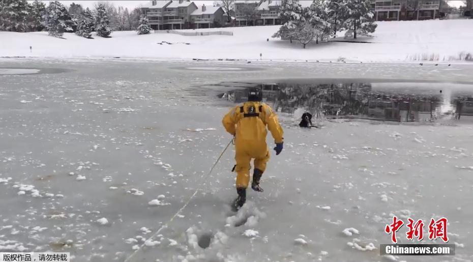 近日,美国科罗拉多州隆娜特里,地铁消防救援人员在几乎结冰的池塘救一只狗。