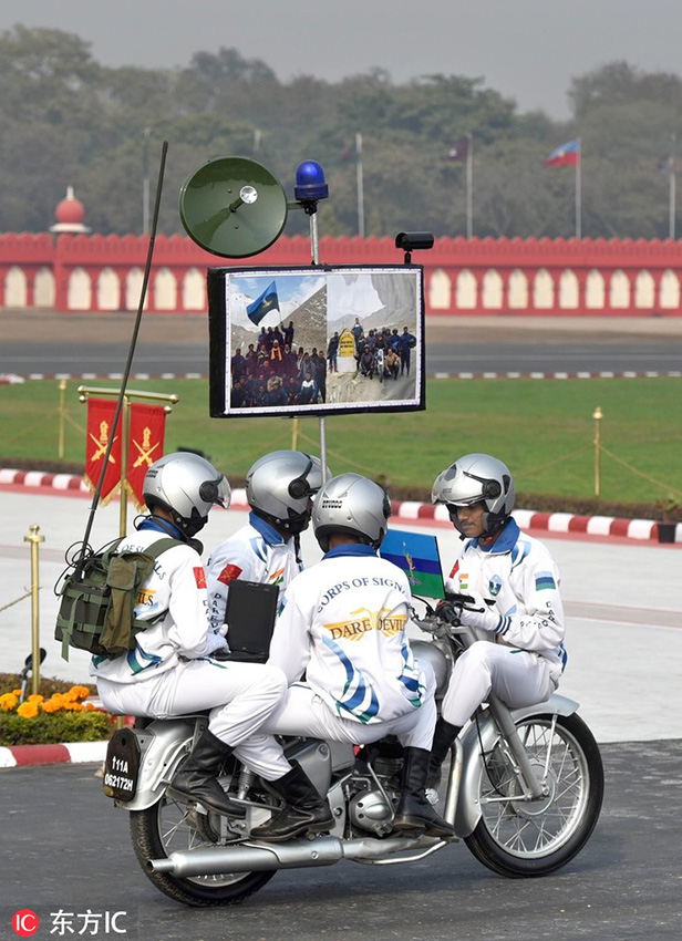 印度士兵参加建军日彩排 “叠罗汉”大秀摩托车特技