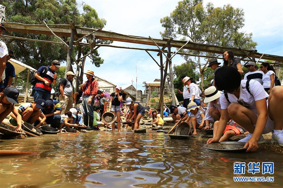 在澳大利亚维多利亚州的巴拉瑞特,游客们尝试从河中找到金沙。(2018年12月27日摄)