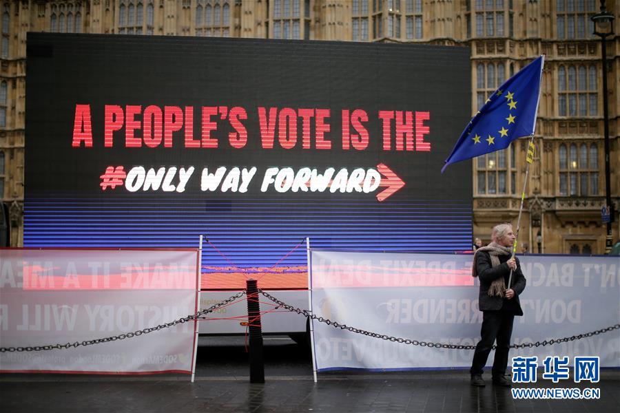 1月16日,在英国伦敦,一名反对英国“脱欧”的人士在议会大厦外参加集会。 英国议会下院15日投票否决了英国政府此前与欧盟达成的“脱欧”协议。英国反对党工党领导人科尔宾向议会下院提起对政府的不信任动议。英国议会将于16日对这份动议进行辩论和投票。 新华社发(蒂姆·爱尔兰摄)