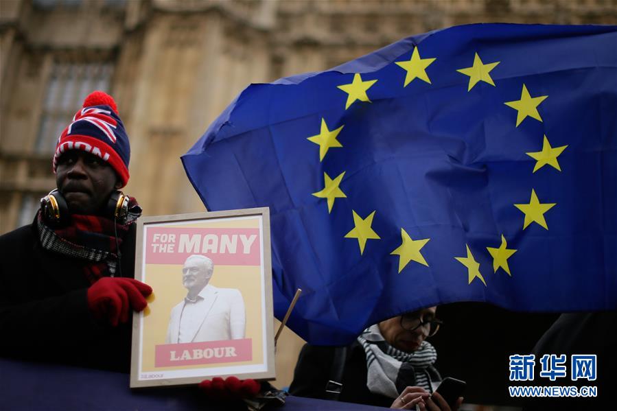 1月16日,在英国伦敦,一名支持反对党工党领导人科尔宾的示威者在议会大厦外参加集会。 英国议会下院15日投票否决了英国政府此前与欧盟达成的“脱欧”协议。英国反对党工党领导人科尔宾向议会下院提起对政府的不信任动议。英国议会将于16日对这份动议进行辩论和投票。 新华社发(蒂姆·爱尔兰摄)