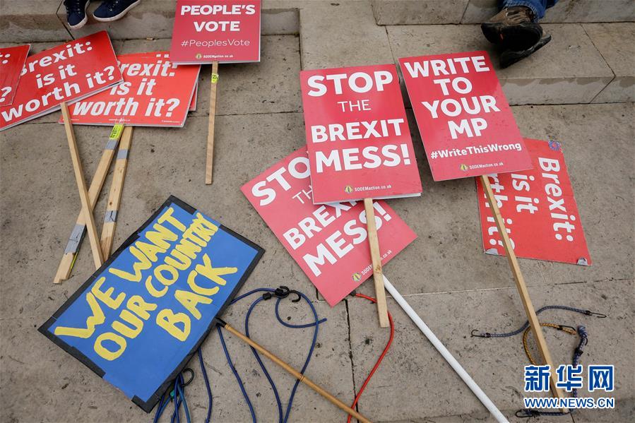 1月16日,在英国伦敦,反对英国“脱欧”的标语牌摆放在议会大厦外的地面上。 英国议会下院15日投票否决了英国政府此前与欧盟达成的“脱欧”协议。英国反对党工党领导人科尔宾向议会下院提起对政府的不信任动议。英国议会将于16日对这份动议进行辩论和投票。 新华社发(蒂姆·爱尔兰摄)