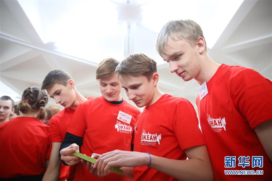 1月16日,在俄罗斯符拉迪沃斯托克的“海洋”全俄儿童中心,俄罗斯青年观看中国政府赠送的礼物。
