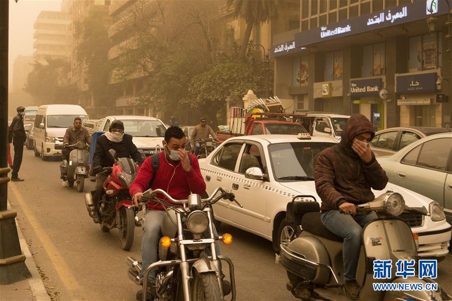 1月16日,在埃及首都开罗,人们戴着口罩出行。 埃及首都开罗16日遭遇沙尘暴天气。 新华社记者 孟涛 摄