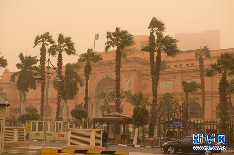 这是1月16日在埃及首都开罗拍摄的笼罩在沙尘暴中的埃及博物馆。 埃及首都开罗16日遭遇沙尘暴天气。 新华社记者 孟涛 摄