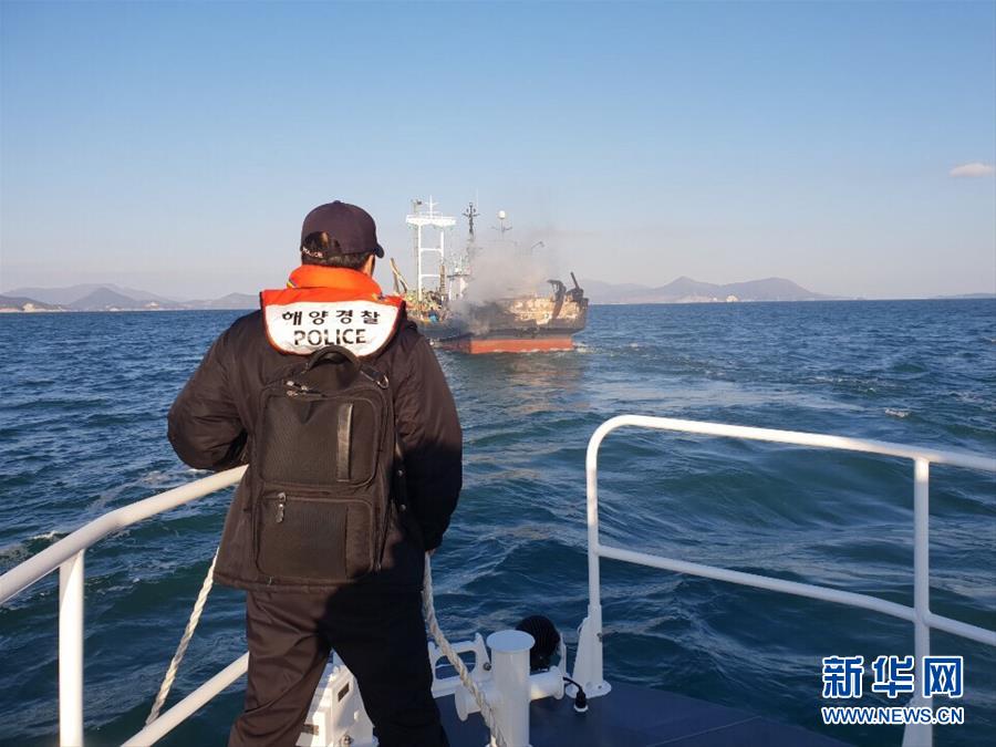 1月17日,在韩国西南部海域,海警搜寻失踪人员。 韩国西南部海域17日发生一起渔船起火事故,截至当地时间当天中午,事故造成越南籍船员一死一伤,一名中国公民失踪。 新华社发(韩国丽水市海洋警察署供图)