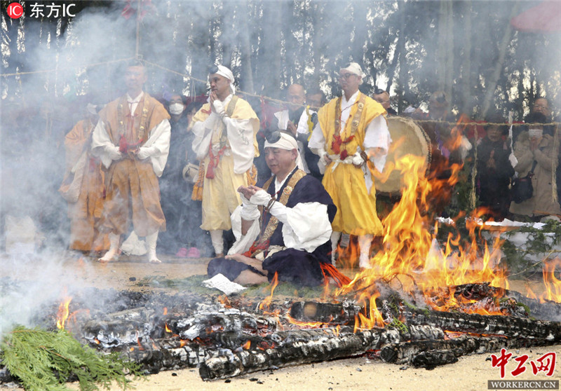 当地时间2019年1月17日,日本福冈县Kogori,当地Nyoiringji佛寺举行Goma Kito仪式,民众赤脚踩火炭祈求身体健康。