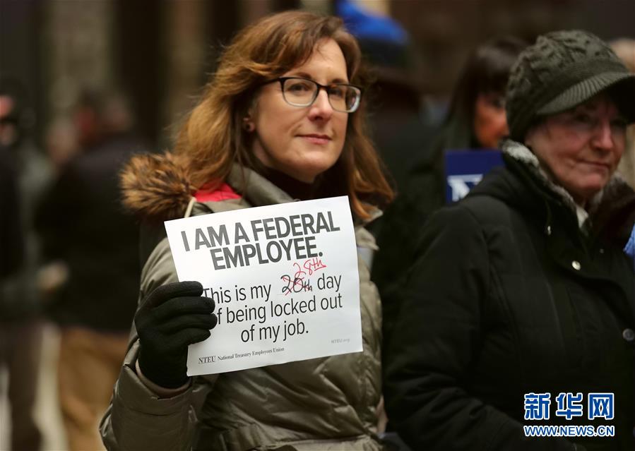 1月18日,在美国芝加哥,人们参加游行抗议政府“停摆”。 当日,数十名联邦雇员和社会活动者聚集在芝加哥市中心的联邦广场,抗议美国联邦政府“停摆”。由于美国白宫和国会民主党人在修建美国和墨西哥边境隔离墙等问题上分歧严重,各方未能就拨款法案达成一致,约四分之一的美国联邦政府机构从去年12月22日凌晨开始陷入“停摆”。 新华社记者汪平摄