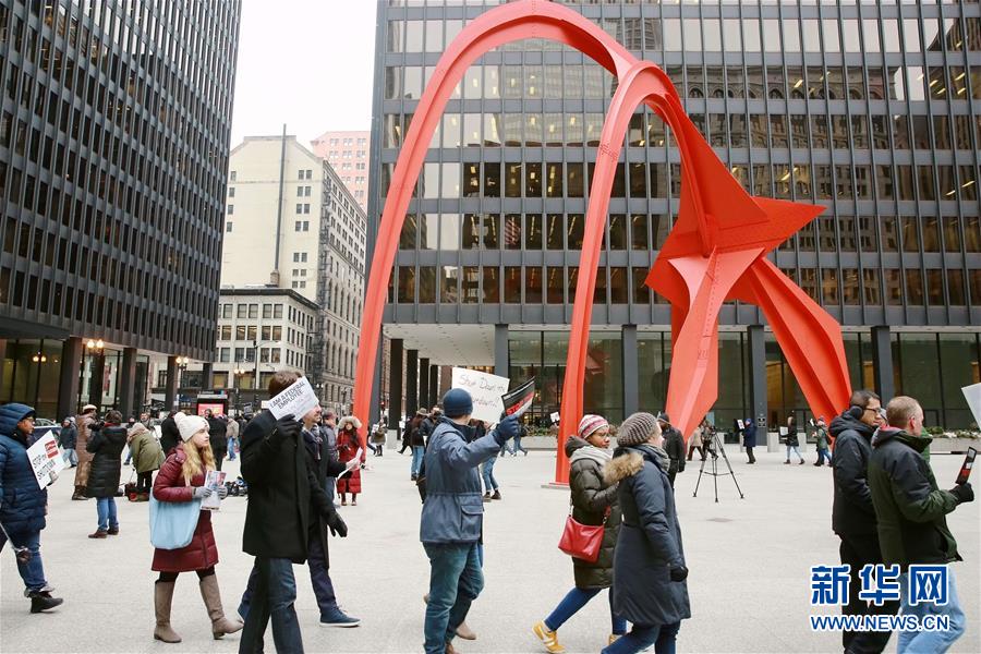 1月18日,在美国芝加哥,人们参加游行抗议政府“停摆”。 当日,数十名联邦雇员和社会活动者聚集在芝加哥市中心的联邦广场,抗议美国联邦政府“停摆”。由于美国白宫和国会民主党人在修建美国和墨西哥边境隔离墙等问题上分歧严重,各方未能就拨款法案达成一致,约四分之一的美国联邦政府机构从去年12月22日凌晨开始陷入“停摆”。 新华社记者汪平摄
