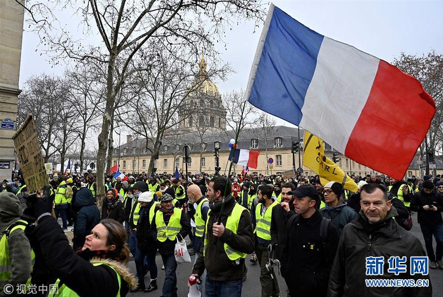当地时间2019年1月19日,法国巴黎,“黄背心”示威者走上街头发起示威抗议活动。(图片来源:视觉中国)